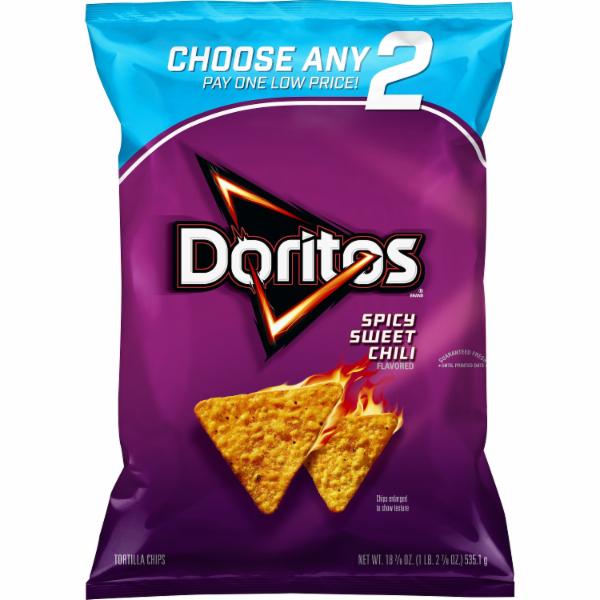 Doritos Spicy Sweet Chili Tortilla Chips 18.875 Ounce Plastic BagCORN, VEGETABLE OIL (CORN, CANOLA, AND/OR SUNFLOWER OIL), SALT, SUGAR, MONOSODIUM GLUTAMATE, FRUCTOSE, SODIUM DIACETATE, SOY SAUCE (SOYBEAN, WHEAT, SALT), ONION POWDER, MALTODEXTRIN (MADE FROM CORN), HYDROLYZED SOY PROTEIN, HYDROLYZED CORN PROTEIN, GARLIC POWDER, TORULA YEAST, MALIC ACID, EXTRACTIVES OF PAPRIKA, SPICES, CARAMEL COLOR, DISODIUM INOSINATE, DISODIUM GUANYLATE, DEXTROSE, AND NATURAL FLAVOR.Doritos Spicy Sweet Chili 18. 875Oz. Warnings Contains soy and wheat ingredients.