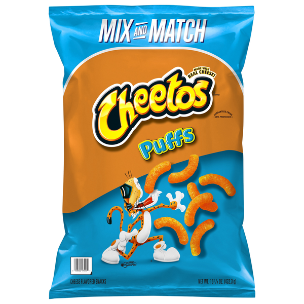 Cheese flavored snacks. Made with real cheese! Gluten free. Mix and match. fritolay.com. Connect with Facebook.com/cheetos. Twitter(at)ChesterCheetah. Instagram(at)Cheetos.