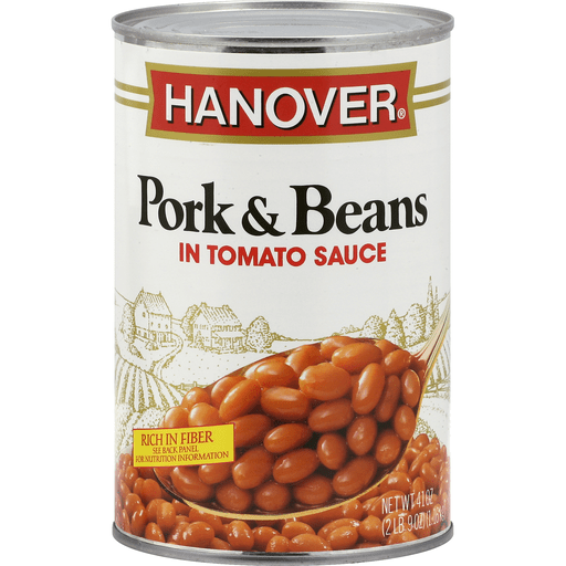 Hanover® Pork & Beans in Tomato Sauce. Rich in fiber. Net Wt 41 oz (2 lb 9 oz) 1.16 kg. When corresponding, please include code information from can end. Find us at: www.hanoverfoods.com.