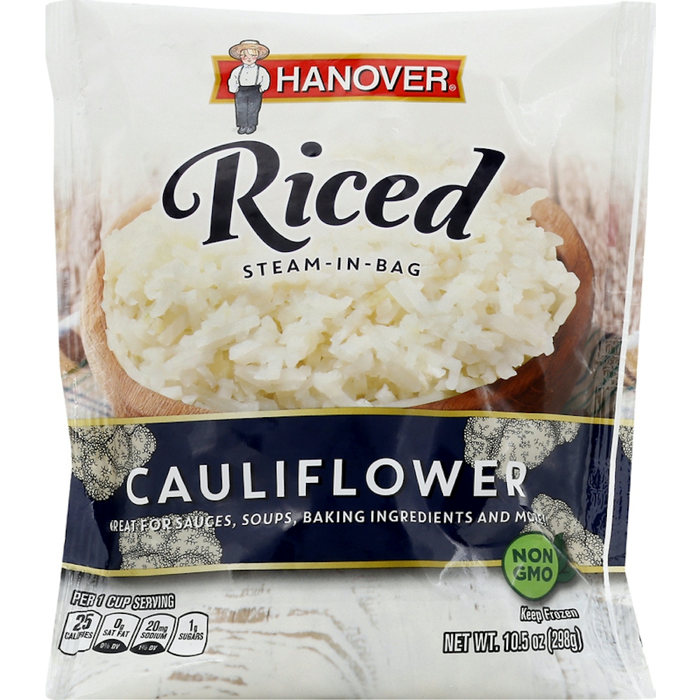 Hanover® Riced Cauliflower Steam-In-Bag. Great for sauces, soups, baking ingredients and more! Per 1 cup serving: 25 calories. 0g sat fat, 0% DV. 20mg sodium, 1% DV. 1g sugars. Vitamin C, 50% DV. Non GMO. Beyond simple sides, Hanover riced cauliflower is an amazing carb friendly ingredient alternative to grain rice and pasta. Commonly used for gluten free pizza crust, mashed sides, sauces and soups, riced cauliflower is cleverly finding its way to the top of the ingredients list! If you are not satisfied with the quality of this product please send specific reason, along with the empty package, your name and address to Hanover Foods Corp., P.O. Box 334, Hanover, PA 17331. Find all of our helpful tips and recipes at www.hanoverfoods.com.