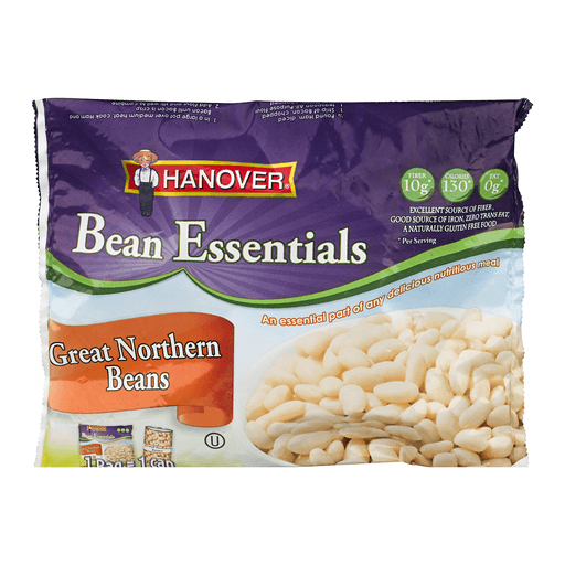 Hanover® Bean Eessentials Great Northern Beans. Fiber 10g*. Calories 130*. Fat 0g*. Excellent source of fiber, good source of iron, zero trans fat, a naturally gluten free food. *Per serving. An essential part of any delicious nutritious meal. 1 bag = 1 can. If you are not satisfied with the quality of this product please send specific reason, along with the empty package, your name and address to Hanover Foods Corp., P.O. Box 334, Hanover, PA 17331. For recipes and serving suggestions, please visit www.hanoverfoods.com. Find us at: www.hanoverfoods.com.