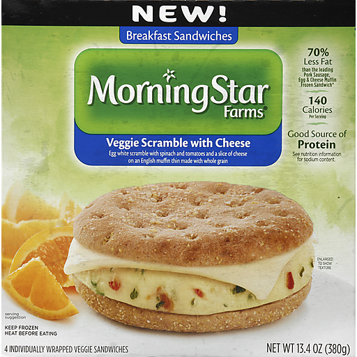 Egg white scramble with spinach and tomatoes and a slice of cheese on an English muffin thin made with whole grain. Individually wrapped veggie sandwiches. New! 70% less fat than the leading pork sausage, egg & cheese muffin frozen sandwich (The leading Pork Sausage, Egg & Cheese Muffin Frozen Sandwich contains 21 g total fat per serving [130 g]; MorningStar Farms Veggie Egg White Scramble with Cheese Muffin Sandwich contains 4.5 g total fat per serving [95 g]). 140 calories per serving. Good source of protein. See nutrition information for sodium content. Good breakfast, good morning! Our MorningStar Farms Veggie Scramble with Cheese Breakfast Sandwiches with quality ingredients like fluffy egg whites, bright veggies and flavorful cheese. They're an eye-opening taste sensation on English muffin thins made with whole grain. A good source of protein with 140 calories each, these delicious breakfast sandwiches are just one more way MorningStar Farms makes eating well tastier and easier. Also try our Sausage, Egg & Cheese breakfast sandwiches! Visit morningstarfarms.com to discover all our veggies products and the endless possibilities of eating well! Give us your feedback. Tell us what you think. Talk to us. And learn more about other new products. newfromkelloggs.com. 2x kfr points. Certified 100% recycled paperboard.