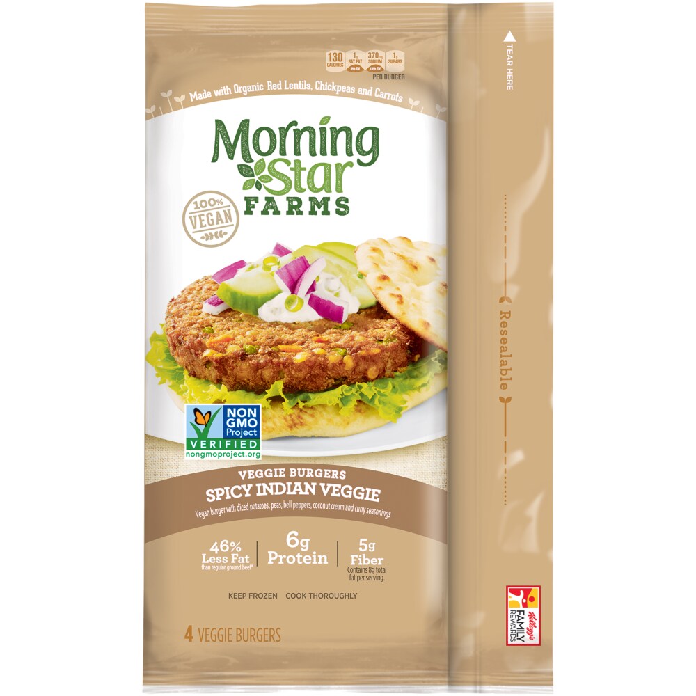 - The manufacturer of Spicy Indian Veggie Vegan Burger with Diced Potatoes is MorningStar Farms.