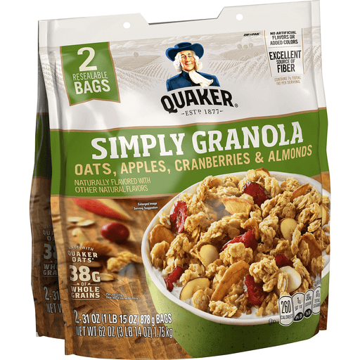Simply Delicious.Quaker® Simply Granola has the great taste of real apples, cranberries, and almonds, a satisfying crunch, and genuine whole grain Quaker Oats.