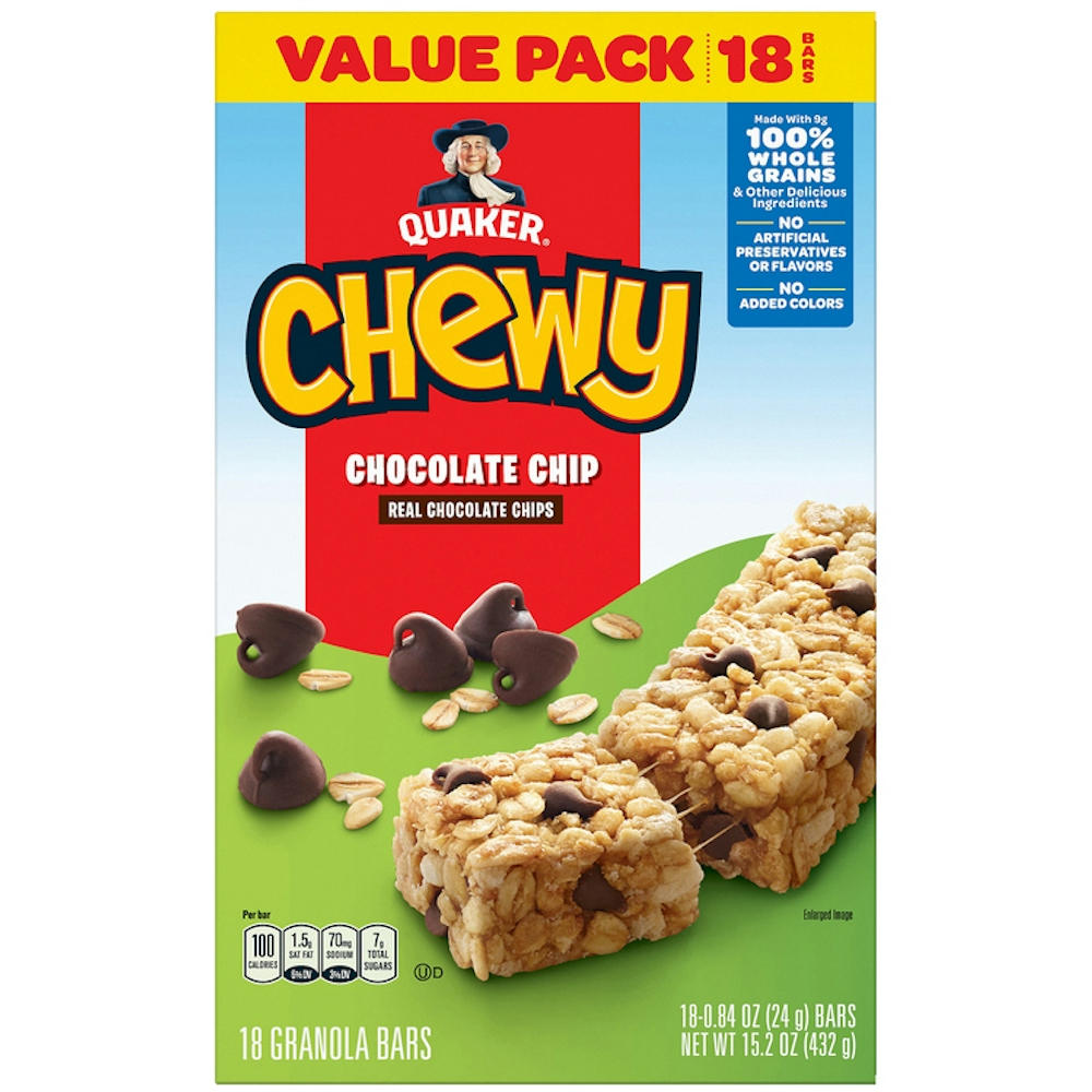 Give your kids the granola bar they love with 100% whole grains and other delicious ingredients. Nothing gets chocolate lovers cheering like a Chocolate Chip Quaker Chewy Bar. Every chewylicious bite is made with real, mouth-watering chocolate chips the kids will love. Plus each bar contains 9 grams of whole grains and no artificial preservatives, artificial flavors or added colors, making it a great choice for snacking anytime!