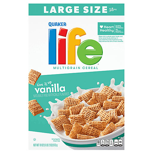 Quaker Life Cereal satisfies the kid in everyone with just the right touch of sweetness and crispy goodness. Helps promote healthy hearts. Diets rich in whole grain foods and other plantfoods and low in total fat, saturated fat, and cholesterol, may reduce the risk of heart disease.