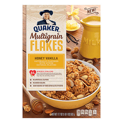 Quaker Multigrain Flakes breakfast cereal has the taste you love for an ideal morning start, with delicious honey and almonds, a satisfying crunch and 44g of whole grain goodness to help fill you up.