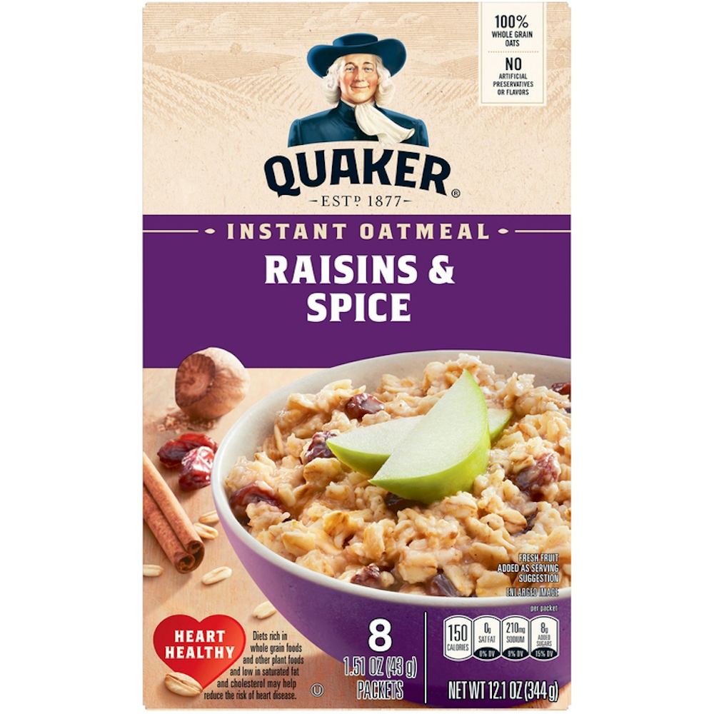 For energy to help take on your morning try a wholesome breakfast with Quaker Raisin & Spice Instant Oatmeal. Enjoy the sweetly warming taste of raisins and spices while the hearty whole grains help fill you up. Single-serving packets are easy to prepare for a hot breakfast on even the busiest morning. Simply empty the packet contents into a bowl, measure and add hot water, and stir. Your oatmeal is ready to eat only 90 seconds later. The packets are also portable, so you can take one with you and prepare a healthy, wholesome bowl of oatmeal anywhere there's hot water.