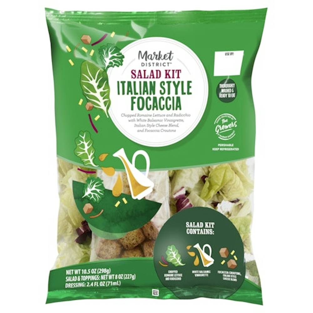 - The manufacturer of Italian Style Focaccia Chopped Romaine Lettuce and Radicchio with White Balsamic Vinaigrette is Market District.