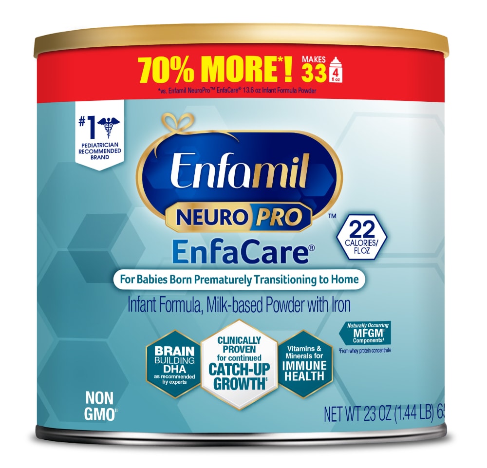 Enfamil NeuroPro EnfaCare is a milk-based, 22 Cal/fl oz, iron-fortified, post-discharge baby formula milk that has enriched* nutrition for immune support for infants who were born prematurely or with low birth weight transitioning to home. Enfamil NeuroPro EnfaCare is the only post-discharge formula that has a fat-protein blend of MFGM† and DHA, previously only found in breast milk. Enfamil NeuroPro EnfaCare newborn baby formula has vitamin and mineral amounts specially tailored for premature babies’ first year of life after discharge from the hospital.
