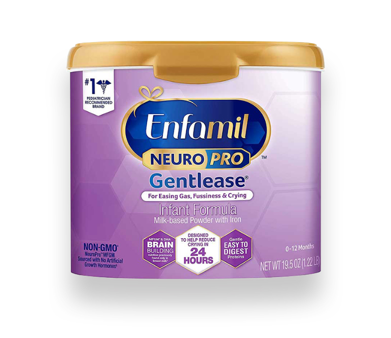 Introducing Enfamil NeuroProCare Gentlease including Beta Carotene for babys eye health. Our trusted Gentlease baby formula, clinically proven to reduce fussiness, colic, baby gas, and crying within 24 hours, now has MFGM that provides brain support first. Enfamil NeuroProCare Gentlease also includes 2-FL HMO, PDX, and GOS; each of these prebiotics have been shown to support immune health. Emerging evidence from a recent clinical study showed MFGM in baby formula supports cognitive development similar to breast milk. NeuroPro is the only infant formula that has a fat-protein blend of MFGM and Omega 3 DHA, previously only found in breast milk. So you can get nutrition for brain support inspired by breast milk from the baby formula brand thats number 1 recommended by Pediatricians. It offers complete nutrition for babies through 12 months with Omega 3 DHA and Choline, important nutrients for brain support, easy-to-digest proteins, and baby probiotics for immune support. As measured by Bayley-III cognitive score at 12 months in a different formula with MFGM added as an ingredient. QuintilesIMS, using the ProVoice Survey fielded from Janurary 2017 to December 31, 2017. In amounts supported by clinical research. Not made with genetically modified ingredients, but trace amounts of genetically engineered materials may be present in the product from manufacturing environments and process sources.