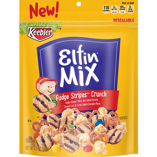 An indulgent, fudgy snack mix to satisfy sweet and salty cravings, any time of day. Rich, sweet, salty, and crunchy; A mix of bite-size Fudge Stripes Minis, miniature salted pretzels, caramel corn, and candy-coated chocolate pieces. Great for solo munching or sharing with friends; No special occasion needed to enjoy this delicious snack mix; Enjoy with an ice-cold glass of milk. Mixed to perfection by the lovable Keebler Elves; Made with pantry-perfect staples like enriched flour; Kosher Dairy; Contains wheat, milk, and soy ingredients. Conveniently packaged in a 6.5-ounce bag; Sealed for freshness and great taste.