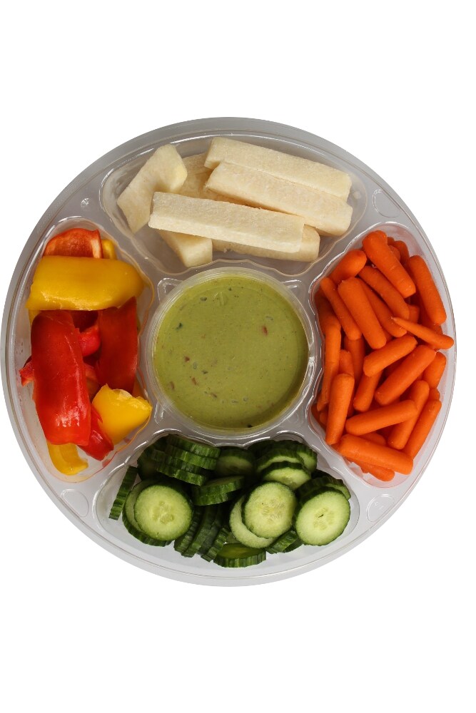 Baby Carrots, Cucumber, Guacamole (Hass Avocados, Roma Tomato, Red Onion, Poblano Pepper, Pasteurized Lime Juice, Kosher Salt, Cilantro), Jicama, Red Bell Pepper, Yellow Bell Pepper.