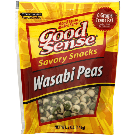 - The manufacturer of Wasabi Peas Savory Snacks is Good Sense.