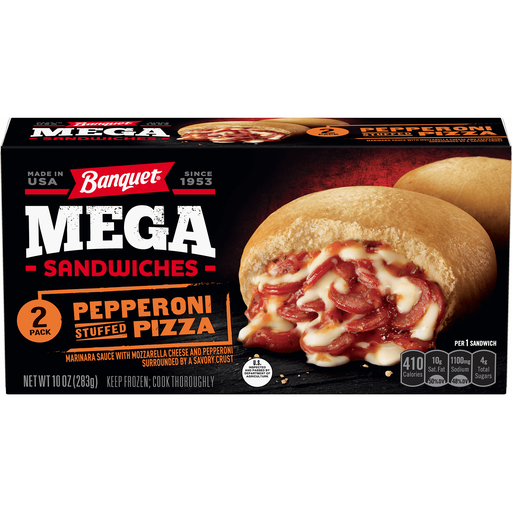 No matter the meal, BANQUET Mega Pepperoni Stuffed Pizza Sandwiches are a satisfying way to curb your hunger. Each box contains two frozen sandwiches made with zesty marinara sauce, parmesan and mozzarella cheese, and pepperoni packed into a round, savory crust. These microwave meals are great for packed lunches and easy snacking. If you can't wait to eat, skip the drive-thru line and enjoy one of these convenient frozen meals as a quick dinner you can prepare in the microwave.