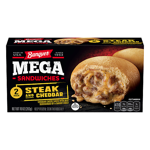 No matter the meal, BANQUET Mega Steak & Cheddar Sandwiches are a satisfying way to curb your hunger. Each box contains two frozen sandwiches made with creamy cheese sauce and diced steak packed into a round, savory crust. These microwave meals are great for packed lunches and easy snacking. If you can't wait to eat, skip the drive-thru line and enjoy one of these convenient frozen meals as a quick dinner you can prepare in the microwave.