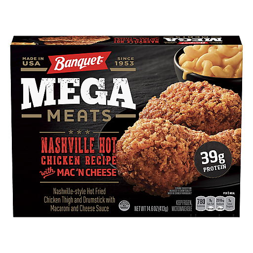 Enjoy the taste of Southern comfort food with Banquet Mega Meats Nashville Hot Fried Chicken with Mac 'N Cheese. A Nashville-style chicken thigh and drumstick are served with creamy cheddar mac 'n cheese for a delicious meal with a kick. You'll get quality ingredients and 39 g protein in this quick, convenient dish that can be microwaved or heated in the oven. Banquet meals have been proudly made in the USA since 1953. Grab a fork and add some spice to your life.