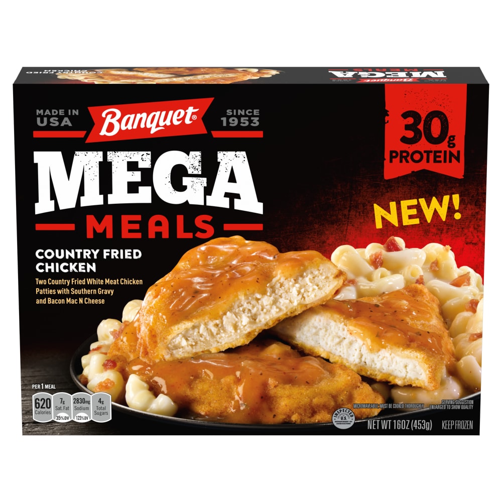 Banquet Mega Meals Country Fried Chicken frozen meal brings two classics to your table in minutes. Featuring white meat chicken patties with southern gravy and bacon mac and cheese for delicious frozen meals. This frozen chicken dinner offers 30 grams of protein per serving to put hunger in its place. Enjoy Banquet Mega Meals as flavorful frozen lunches or quick and easy frozen dinners any day of the week. Preparation of these ready made meals is easy. Just follow the instructions on the box to heat the frozen food in the oven for fresh-baked flavor or in the microwave for quicker cook time. Store the 16 ounce frozen fried chicken meal in the freezer until you’re ready to enjoy. Banquet Mega delivers hearty meals that will keep bringing you back for more.
