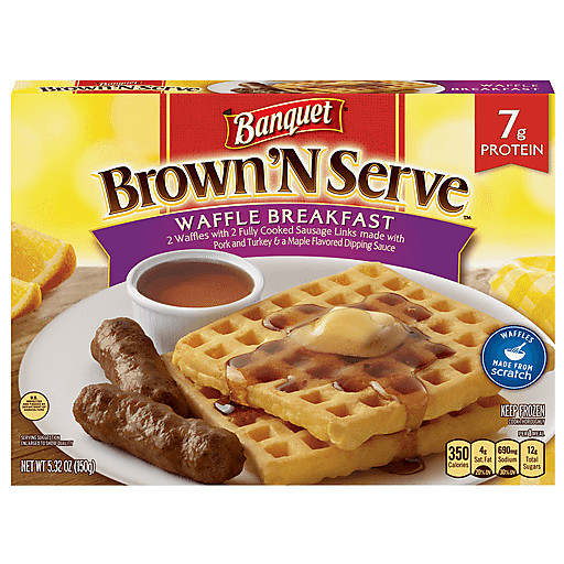 2 waffles with 2 fully cooked sausage links made with pork and turkey & a maple flavored dipping sauce. 7 g protein.