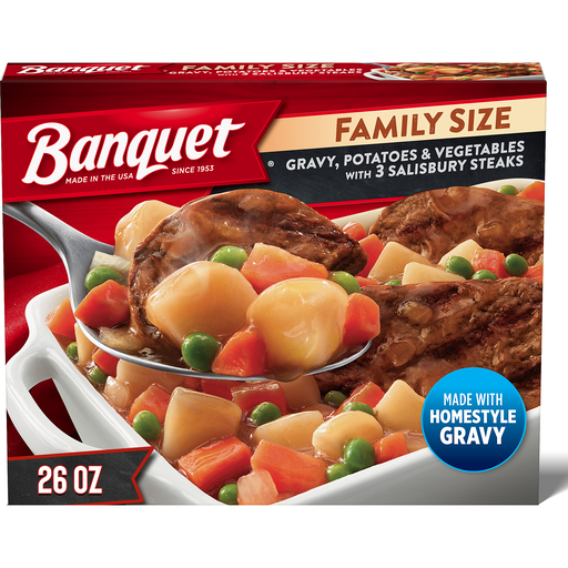 With quality, mouthwatering ingredients, a great frozen steak meal is just minutes away with Banquet Family Size Salisbury Steak with Gravy, Potatoes and Vegetables. Satisfy every appetite with this family size frozen food meal of savory Salisbury steaks smothered in homestyle gravy with potatoes and veggies to round out the frozen family meals. Made with wholesome ingredients, these frozen family dinners offer delicious comfort food for easy meals for the family any day of the week. Serve this frozen dinner by itself or add rolls on the side. Preparation is easy in the microwave in 13 to 14 1/2 minutes or 55 to 58 minutes in the oven; let stand for 5 minutes. Store this 26 ounce family size frozen meal in the freezer until ready to prepare. For over 60 years, Banquet has been making delicious food the whole family loves.