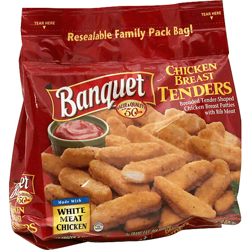 - The manufacturer of Chicken Breast Tenders Breaded Patties with Rib Meat is Banquet.