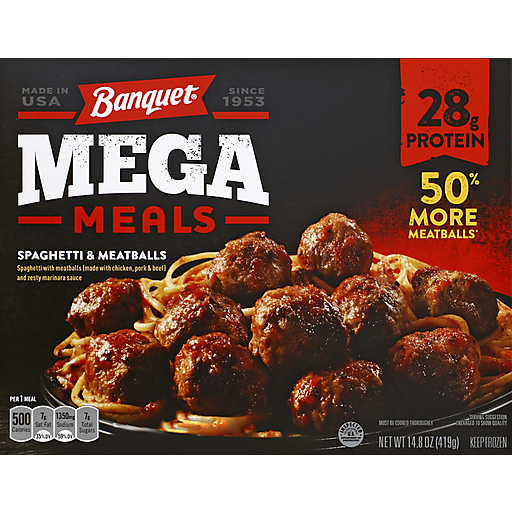 Spaghetti with meatballs (made with chicken, pork & beef) and zesty marinara sauce. 50% more meatballs (Compared to our previous Banquet 13.2 oz of spaghetti and meatballs Mega Meal). 28 g protein.
