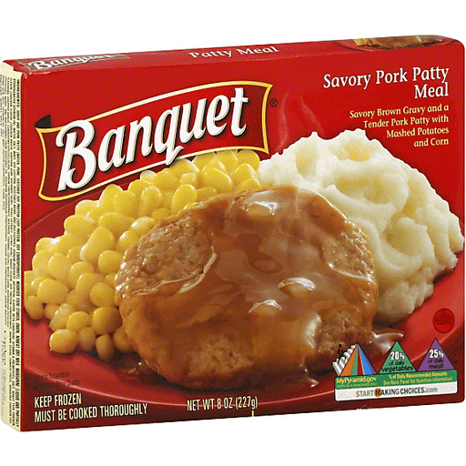 - The product category for Banquet, Pork Patty Meal is Pork Rinds.