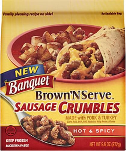 - The product category for Banquet, Brown 'N Serve, Fully Cooked Sausage Crumbles, Hot & Spicy, Banquet, Brown 'N Serve, Fully is Meat.
