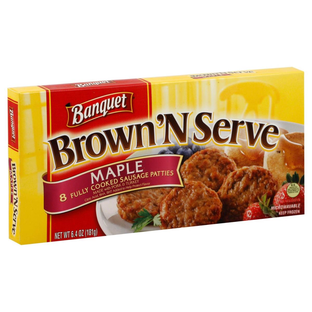 Banquet Brown ‘N Serve Vermont Maple Fully Cooked Sausage Patties Frozen Meat offers an easy way to treat yourself and family to a hearty frozen breakfast side. These precooked breakfast sausage patties are made with pork, turkey, and a special blend of spices and seasonings. Banquet Brown ‘N Serve Vermont Maple Sausage is gluten free and has 6 grams of protein per serving. Enjoy ground pork and turkey sausage patties as part of a hot and hearty breakfast that will please the whole family. With the commotion of getting ready for work and school, these breakfast sausages take away the headache of what to eat for breakfast on a hectic morning. Prepare the frozen sausages in a skillet in 7 to 8 minutes for that fresh out of the skillet taste, or in a microwave for 1 1/2 minutes; let stand 1 minute. Keep the 8 pack of frozen sausage patties in the freezer until ready to prepare. For over 60 years, Banquet has been making delicious food the whole family loves.