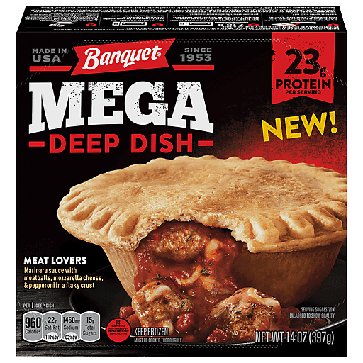 Meat lovers rejoice—Banquet Mega Meat Lovers Deep Dish is here to satisfy your craving. It's stuffed with meatballs and pepperoni, then combined with a delicious marinara sauce and melted mozzarella cheese. It's all wrapped up in a flaky, made-from-scratch crust. With 23 g protein and a flavor you'll love, it's a perfectly convenient meal. Banquet meals have been proudly made in the USA since 1953. Go ahead and dig in.
