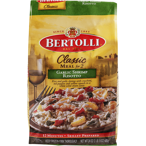 Bertolli® Classic Meal for 2 Garlic Shrimp Risotto. Since 1865. Rice and garlic shrimp with zucchini, red peppers and yellow squash in a white wine cream sauce. 12 minutes. Skillet prepared. Bertolli® classic Italian style meals for two offer a complete menu inspired by fine restaurants in Italy in the comfort of your own home. Quality cuts of meat, chicken or succulent shrimp paired with crisp vegetables and delicious rice, pasta or potatoes complete our recipes. Now you never have to go out to enjoy great Italian any night of the week! Our version of this favorite Italian rice dish. Perfectly cooked al dente rice in a creamy white wine sauce with succulent garlic shrimp, zucchini, yellow squash and red peppers to create a colorful and truly enticing dish. Suggested wine pairing sauvignon blanc. Try our additional authentic Italian recipes visit us at: www.villabertolli.com. Bertolli® has been at the heart of Italian style cooking and eating for over 145 years. Since it began in Lucca, Tuscany in 1865, Bertolli® has been producing premium quality food with passion and care. Rice and garlic shrimp with zucchini, red peppers and yellow squash in a white wine cream sauce. ConAgra Foods®. Food you love. Questions or comments, visit us at www.villabertolli.com or call Mon - Fri, 9:00AM-7:00PM (CST), 1-800-418-2302 (except national holidays). Please have entire package available when you call so we may gather information off the label.