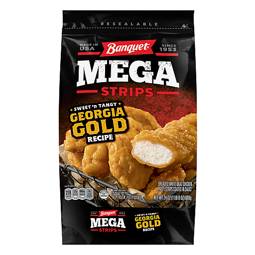 - The manufacturer of Georgia Gold Recipe Breaded White Meat Chicken Patty Strips Coated in Sauce Mega Strips is Banquet.