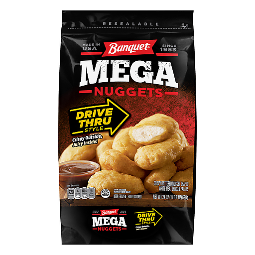 - The manufacturer of Drive Thru Style Crispy Battered Nugget Shaped White Meat Chicken Patties Mega Nuggets is Banquet.