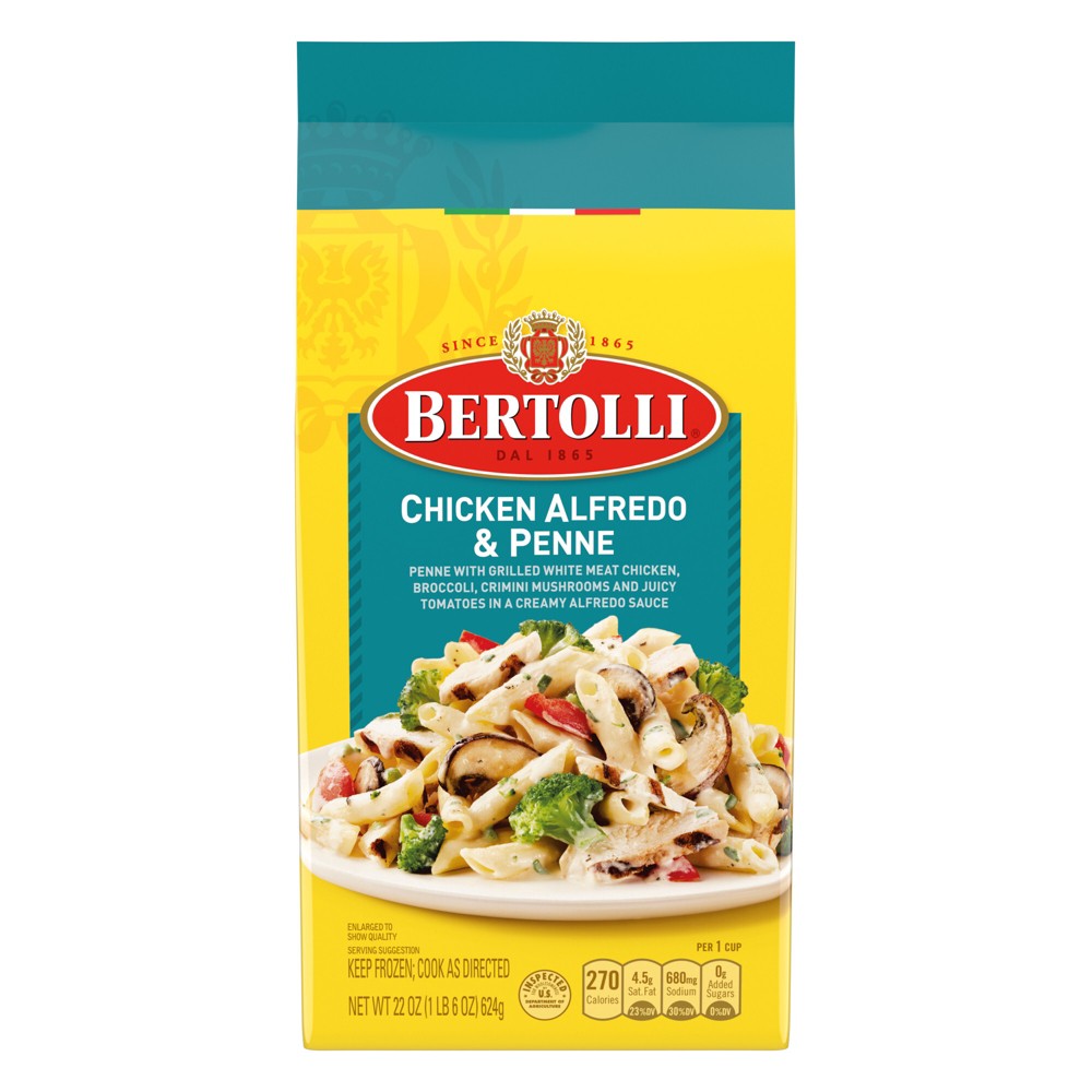 Experience a delicious, restaurant-style dining experience at home with Bertolli Chicken Alfredo and Penne Frozen Meals. Featuring penne pasta with grilled white meat chicken, broccoli, crimini mushrooms and juicy tomatoes in a rich and creamy Alfredo sauce for frozen dinners with Italian-inspired flavor. Made with wholesome ingredients, this frozen meal ensures delicious and satisfying frozen entrees every time. Deliciously simple cuisine at your fingertips; these frozen pasta meals provide Italian-inspired flavor in quick ready made meals that can be prepared in the comfort of your home. Simply cook this frozen food on the stove top according to the package instructions for easily prepared meals in minutes. Store this 22 ounce meal kit in your freezer until you're ready to enjoy. Bertolli's flavorful frozen skillet meals are thoughtfully prepared in Italian-inspired tradition. Premium.