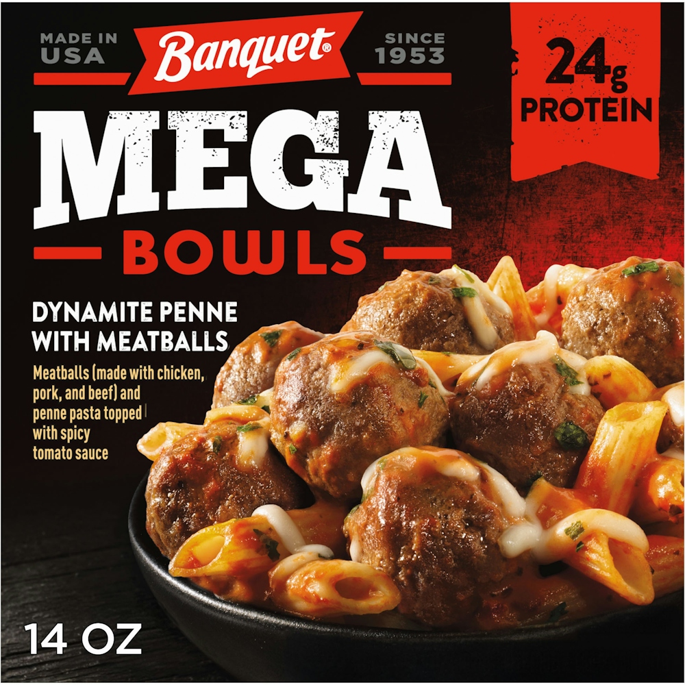 Banquet Mega Bowls Dynamite Penne and Meatballs frozen meal brings exciting flavor to your table. Featuring meatballs made with chicken, pork and beef in spicy creamy tomato sauce layered over penne pasta topped with mozzarella cheese for a delicious meatballs and penne pasta bowl with a kick. This frozen pasta bowl offers 24 grams of protein per serving to put hunger in its place. Enjoy Banquet Mega Bowls as flavorful frozen lunches or quick and easy frozen dinners any day of the week. Preparation of these ready made meals is easy. Just follow the instructions on the box to heat the frozen food in the oven for fresh-baked flavor or in the microwave for quicker cook time. Store the 14 ounce frozen meal in the freezer until you’re ready to enjoy. Banquet Mega delivers hearty meals that will keep bringing you back for more.