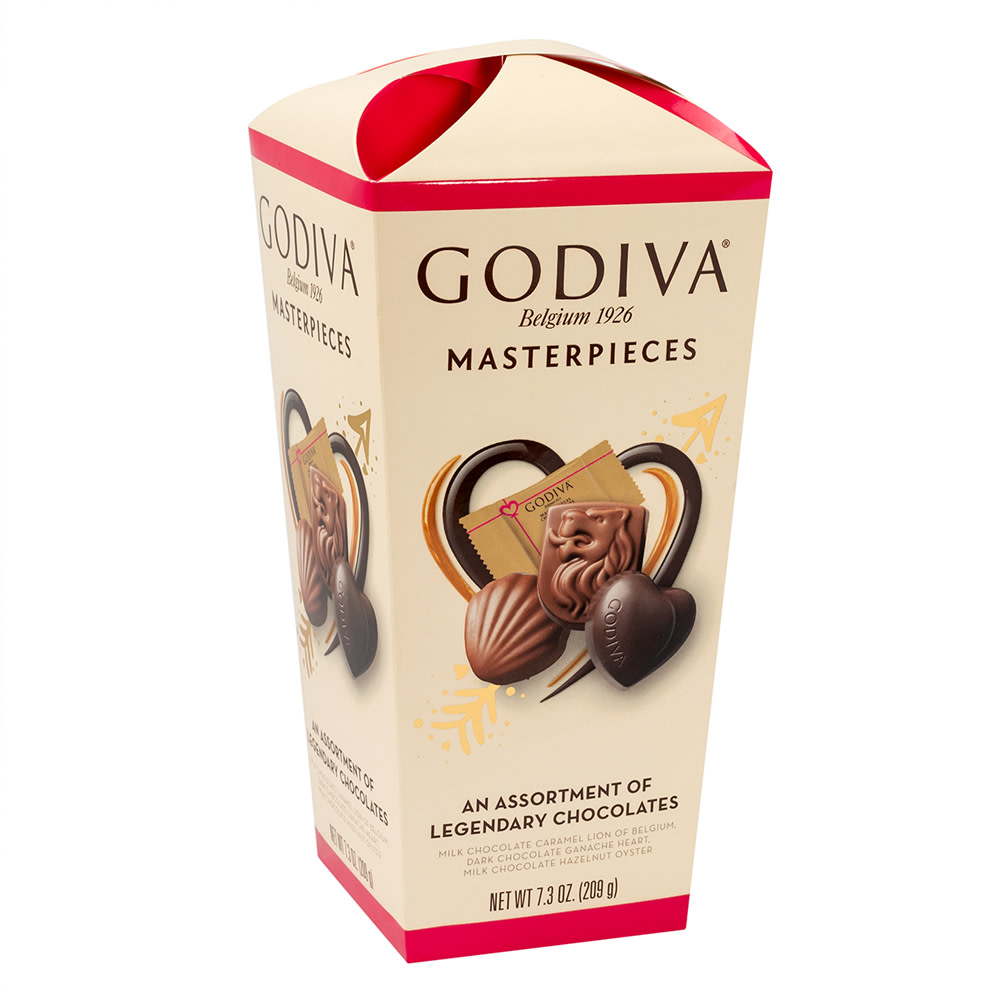 An assortment of legendary chocolates. Milk chocolate caramel lion of Belgium, dark chocolate ganache heart. Milk chocolate hazelnut oyster. Belgium 1926. Godiva Masterpieces are individually wrapped mini chocolates, perfect to enjoy anytime. Each Masterpiece is crafted in the shape of a signature chocolate and filled with smooth and creamy fillings that melt in your mouth. This Masterpieces Assortment includes our Dark Chocolate Ganache Heart with velvety dark chocolate filling, Milk Chocolate Caramel Lion of Belgium with a smooth caramel filling, and Milk Chocolate Hazelnut Oyster with a creamy hazelnut praline filling. This variety of signature pieces offers the best of Godiva chocolate, made to savor every day. www.godiva.com. Product of Turkey.