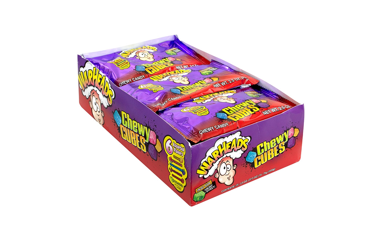 Soft, Chewy Cubes from Warheads® pack a fruity flavor with a mild sour punch. The soft chew and six assorted fruity flavors including orange, green apple, watermelon, blue raspberry, strawberry, and black cherry satisfy a sweet tooth.