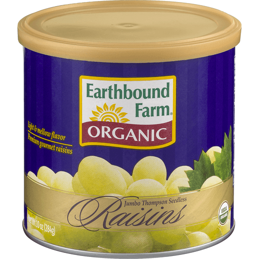 Earthbound Farm® Organic Jumbo Thompson Seedless Raisins. Light & mellow flavor. Premium gourmet raisins. USDA organic. Plump, chewy and naturally sweet, Earthbound Farm raisins are made from organically grown premium jumbo table grapes that were vine-ripened for maximum flavor. They're healthy and delicious-enjoy! Hungry for more Cook. Explore. Shop. Learn. www.ebfarm.com. Certified organic by CCOF. www.ccof.org. Filled by weight not by volume. Food to live by: the Earthbound Farm organic cookbook, with more than 250 delicious recipes, is now available wherever books are sold. This product is certified kosher by the Orthodox Union. Questions or comments 1-800-690-3200.