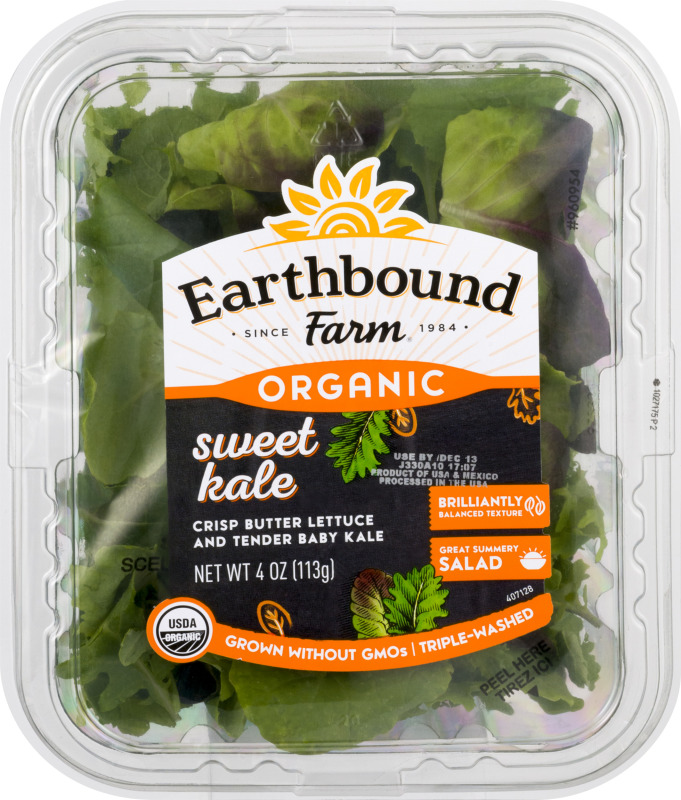 Earthbound Farm® Organic Sweet Kale. Since 1984. Crisp Butter Lettuce And Tender Baby Kale. Brilliantly Balanced Texture. Great Summery Salad. Triple-Washed. USDA Organic. Net Wt 4 Oz (113g). In 1984, on 2 1/2-acres in California's verdant carmel valley. Drew & Myra goodman started Earthbound Farm. Rooted on that tiny farm, our commitment to organic has grown stronger every year. Thank you for choosing organic! Grown Without GMOs. Perishable. Certified Organic by CCOF. www.ccof.org. Especially happy with this salad Not quite Get in touch: 1-800-690-3200. www.earthboundfarm.com. ©2016 Earthbound Farm, LLC.