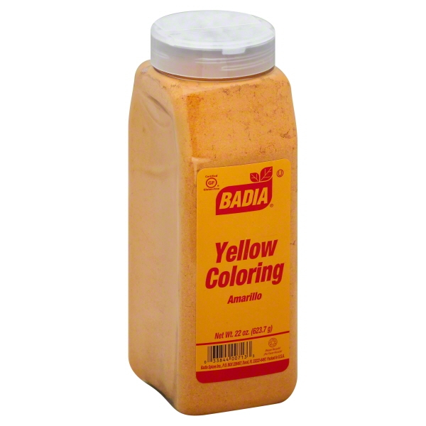 With corn flour and spices Badia Amarillo Yellow Coloring is used for coloring soups and rice dishes. Add brilliant color to paella and chicken & rice and even desserts.