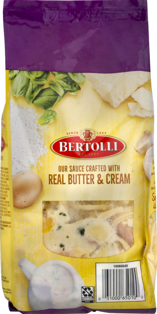 Bertolli Shrimp Scampi & Linguine Complete Skillet Meal for Two. Since 1865. Pasta and shrimp with roasted peppers in a garlic sauce. Skillet ready in 9 minutes. Bertolli has been at the heart of Italian cooking and eating for over 135 years. Since it began in Lucca, Tuscany in 1865, Bertolli has been producing premium quality food with passion and care. Bertolli, chicken florent & farfalle. Bertolli, extra virgin. Bertolli, tomato & basil. This enticing dish is truly a garlic lover's dream. Linguine pasta cooks up al dente and twirls around your fork just like restaurant pasta. Succulent shrimp, roasted red peppers, yellow bell peppers, and slivers of garlic are topped with a creamy garlic sauce.