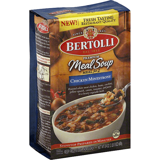 - The product category for Bertolli, Meal Soup for 2, Chicken Minestrone is Prepared Meals & Entrées.