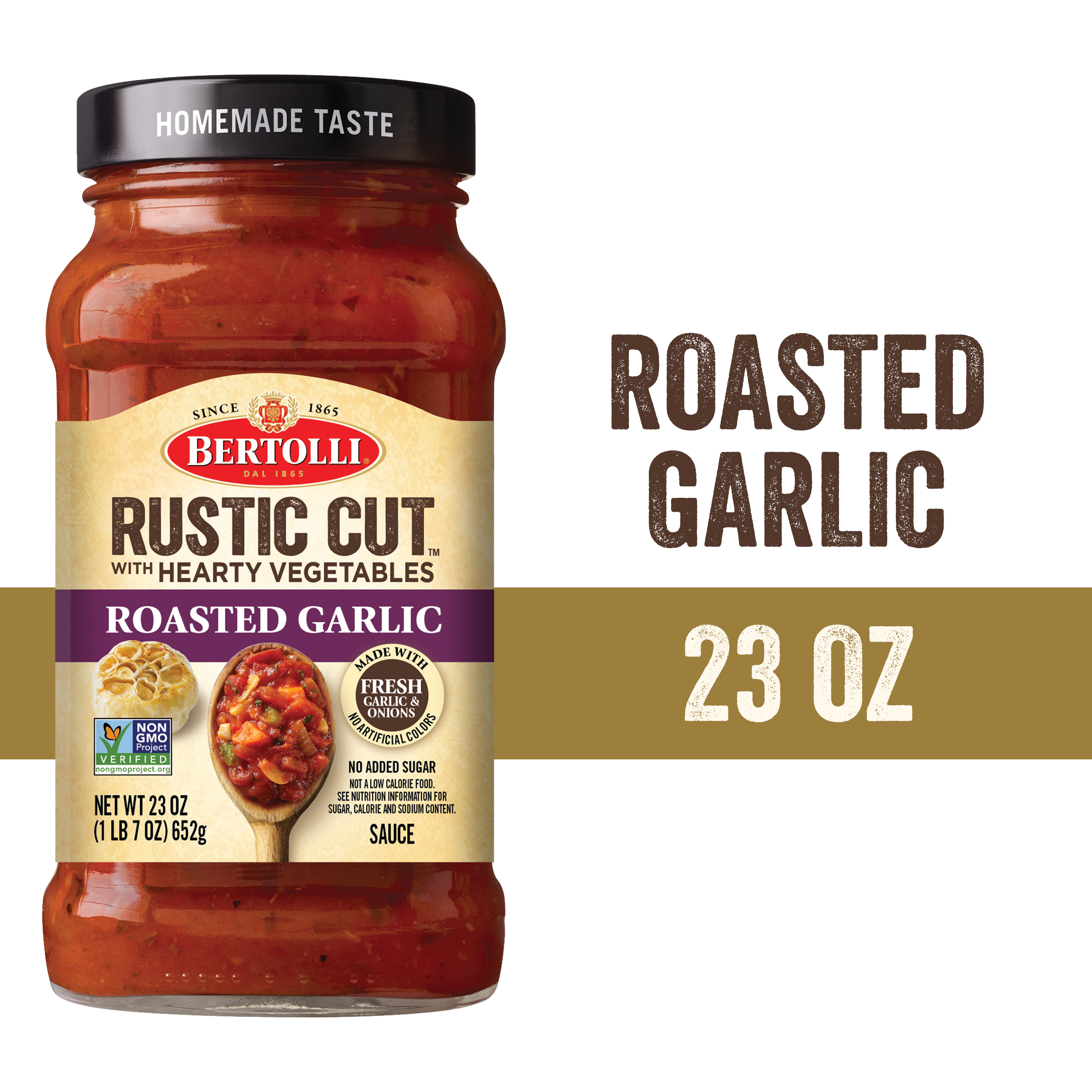 - The manufacturer of Roasted Garlic Rustic Cut Pasta Sauce with Hearty Vegetables, Roasted Garlic is Bertolli.