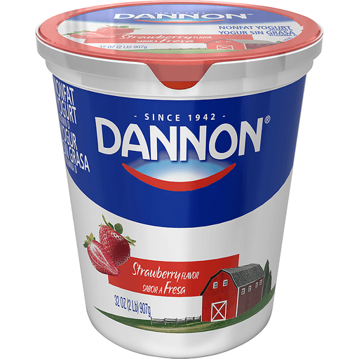 Dannon® Nonfat Yogurt Strawberry. Since 1942. Vitamin D. Strawberry flavor. 32 oz (2 lb) 907g. For a tastier day! No high fructose corn syrup. No artificial colors or flavors. Excellent source of calcium. Grade A. Live & active cultures.™* Contains active yogurt cultures. For delicious recipe ideas! Visit our website. Partially produced with genetic engineering. *Meets National Yogurt Association Criteria. Certified Gluten-free. Comments Call: 1-877-326-6668. Visit: www.dannon.com. © 2017 Dannon.