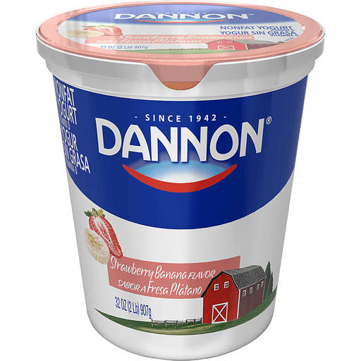 Dannon® Nonfat Yogurt Strawberry Banana. All natural ingredients with Vitamin D. Non GMO Project Verified. nongmoproject.org. 32 oz (2 lb) 907g.