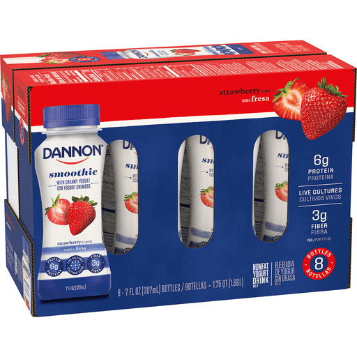 Dannon Smoothies Strawberry Flavored Lowfat Yogurt Drinks combine creamy, smooth Dannon yogurt with the flavor of tasty strawberries for a drinkable yogurt that is simply delicious. Made with high-quality ingredients, including Grade A milk, strawberry puree and live and active cultures, this lowfat yogurt drink pack provides 6g of protein and 3g of fiber per serving. Each serving is also an excellent source of calcium and vitamin D, making it a great addition to your daily routine. Packaged in convenient 7 fl oz smoothie bottles, Dannon yogurt smoothies are a fantastic and convenient yogurt drink for the family. Blend with your favorite fruits for a flavorful protein smoothie mix, take a few bottles to work as office snacks, or grab a bottle for a nutrient-packed drink on the go. Crafting yogurts you can trust since 1942, Dannon is committed to providing high-quality, traditional yogurt products that are simply delicious and easy to enjoy. Dannon is proud to be part of Danone North America, a Certified B Corp. Be sure to check out all of the Dannon yogurt varieties to find the right style for you. Bring deliciousness with you wherever you go with a tasty 8-pack of Dannon Smoothies Strawberry Flavored Lowfat Yogurt Drinks.