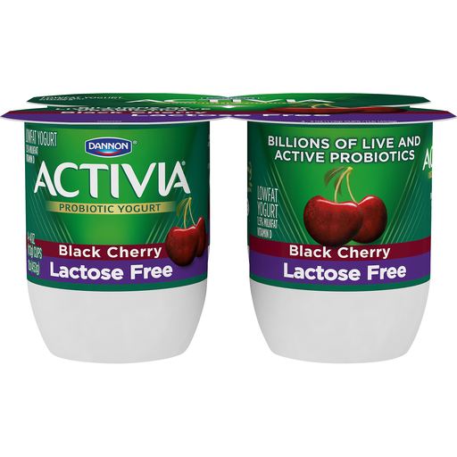 Dannon® Activia® Lactose Free Lowfat Yogurt Black Cherry. 1.5% milkfat/vitamin D. New. Probiotic yogurt with bifidus. Billions of probiotics in every cup. 4-4 oz (113g) cups/1 lb (453g).