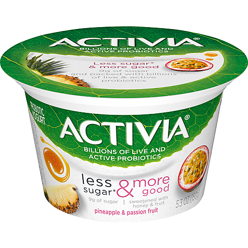 Certified gluten free. Less sugar (At least 40% less sugar than our regular Activia Greek nonfat yogurt) & more good. 9 g of sugar and packed with billions of live & active probiotics. Activia less sugar (At least 40% less sugar than our regular Activia Greek nonfat yogurt), More Good: 9 g total sugar; Activia Greek: 16-21 g sugar (varies by flavor) per 5.3 oz. Non GMO Project verified. nongmoproject.org. Billions of live and active probiotics. Sweetened with honey & fruit. Enjoying Activia twice a day for two weeks as part of a balanced diet and healthy lifestyle may help reduce the frequency of minor digestive discomfort, which includes gas, bloating, abdominal discomfort and rumbling. It’s pretty simple really. We use less sugar (At least 40% less sugar than our regular Activia Greek nonfat yogurt), so you can enjoy more good. Like our billions of live & active probiotics, and sweetness from honey & fruit. Grade A. www.activia.us.com. Comments? Call or text 1-877-326-6668. Find us www.activia.us.com. Danone: Part of the Danone family. Activia Less Sugar* & More Good Probiotic Yogurt delivers that same great Activia taste, but this time, with less sugar*. Sweetened with honey and fruit, every spoonful is smooth, creamy, and full of pineapple and passion fruit goodness. This delicious, Non-GMO Project Verified yogurt not only provides protein and calcium, but billions of live and active probiotics as well. Best of all, it comes in single-serve cups, so you can treat your taste buds and your gut** while out and about. For the last 20 years, Activia has been supporting gut health research**. Every serving of Activia probiotic yogurt comes with four live and active cultures, plus Bifidus, our exclusive probiotic strain. With our wide and delicious selection of probiotic yogurts and smoothies, we make it easy to help support your gut** as part of a healthy lifestyle. *At least 40% less sugar than our regular Activia Greek nonfat yogurt. Activia Less Sugar, More Good: 9g total sugar; Activia Greek: 16-21g sugar (varies by flavor) per 5.3 oz **Enjoying Activia twice a day for two weeks as part of a balanced diet and healthy lifestyle may help reduce the frequency of minor digestive discomfort. Minor digestive discomfort includes bloating, gas, abdominal discomfort, and rumbling.; For the last 20 years, Activia has been helping support gut health research*. Every serving of Activia comes with four live and active cultures, plus Bifidus, our exclusive probiotic strain. With our wide and delicious selection of probiotic yogurts and smoothies, we make it easy to help support your gut as part of a healthy lifestyle.