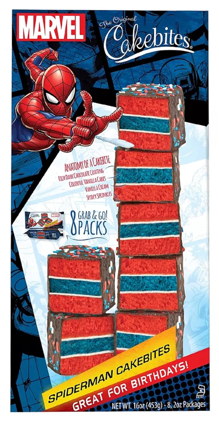 Eight Grab & Go packs in each box. Marvel Spiderman CakeBites. Individually wrapped servings. All the cake in just one bite.