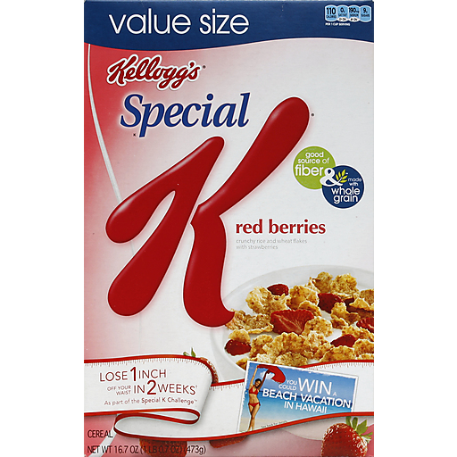 Kellogg's Value Size Special K Red Berries Cereal. Good Source of Fiber & Made with Whole Grain. Crunchy Rice and Wheat Flakes with Strawberries. 110 calories. 0g sat fat, 0%DV. 190mg sodium, 8%DV. 9g sugars. Per 1 cup serving. Kellogg's family reward$. kelloggsfamilyrewards.com. Take the Special K Challenge. Drop a jean size in 2 weeks. Meal No. 1. Kick-start your day with a great-tasting breakfast! Enjoy a serving of Special K cereal (any flavor*) with 2/3 cup skim milk and your favorite fruit. Meal No. 2. For an on-the-go option, stay satisfied** with a Special K protein shake, available in 4 mouth-watering flavors. You can also try a Special K protein meal bar or have another serving of Special K cereal (any flavor*) with 2/3 cup skim milk and fruit. Snacks. You deserve a great-tasting snack - that's why you can choose 2 Special K snacks to enjoy throughout the day: Special K protein snack bars, Special K cereal bars, cracker chips, pastry crisps and crackers.*** Consume fruit and vegetables for additional snacks. Drink beverages as you normally do. Meal No. 3. Eat your third meal as you normally do. Stir up some spicy Asian chicken stir fry for a delicious third-meal option or try another challenge-friendly recipe found at specialk.com! Design your own free, personalized plan and get great third-meal recipes at specialk.com. What Will You Gain When You Lose. BCTGM. K, kellogs.com. K please recycle. kelloggs.com/ourfuture. 100% Recycled Paperboard. Size: sassy you're so much more. Than a number. ****If choosing Special K crackers as your snack, please enjoy 17 crackers for 90 calories. Easy open bag. USA Proud Sponsor. 100% Whole Grain. 8g or more per serving. wholegrainscouncil.org. Eat 48g or more of whole grains daily. Questions or comments. Call 1-800-962-1413. Visit kelloggs.com. Write P.O. Box CAMB Battle Creek, MI 49016. Provide production code on package.